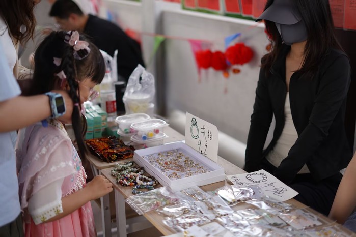 我校学生志愿者还充分发挥专业特长,精心布置了十个展台,涵盖手工艺品制作、青春茶饮铺等内容,吸引众多市民和游客驻足互动。