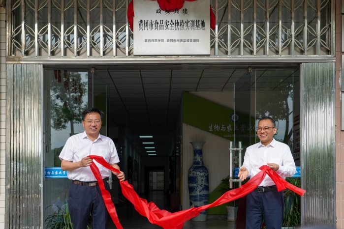 本网讯 6月5日上午,黄冈市食品安全快检实训基地揭牌仪式在我校生物楼举行。校党委副书记、校长漆昌柱,黄冈市市场监督管理局党组书记、局长余水兵出席仪式。